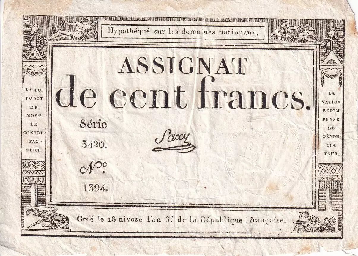 Banknote France 100 Francs - 18 Nivose An III - (07.01.1795) - Sign. Saxy - Serial 3420