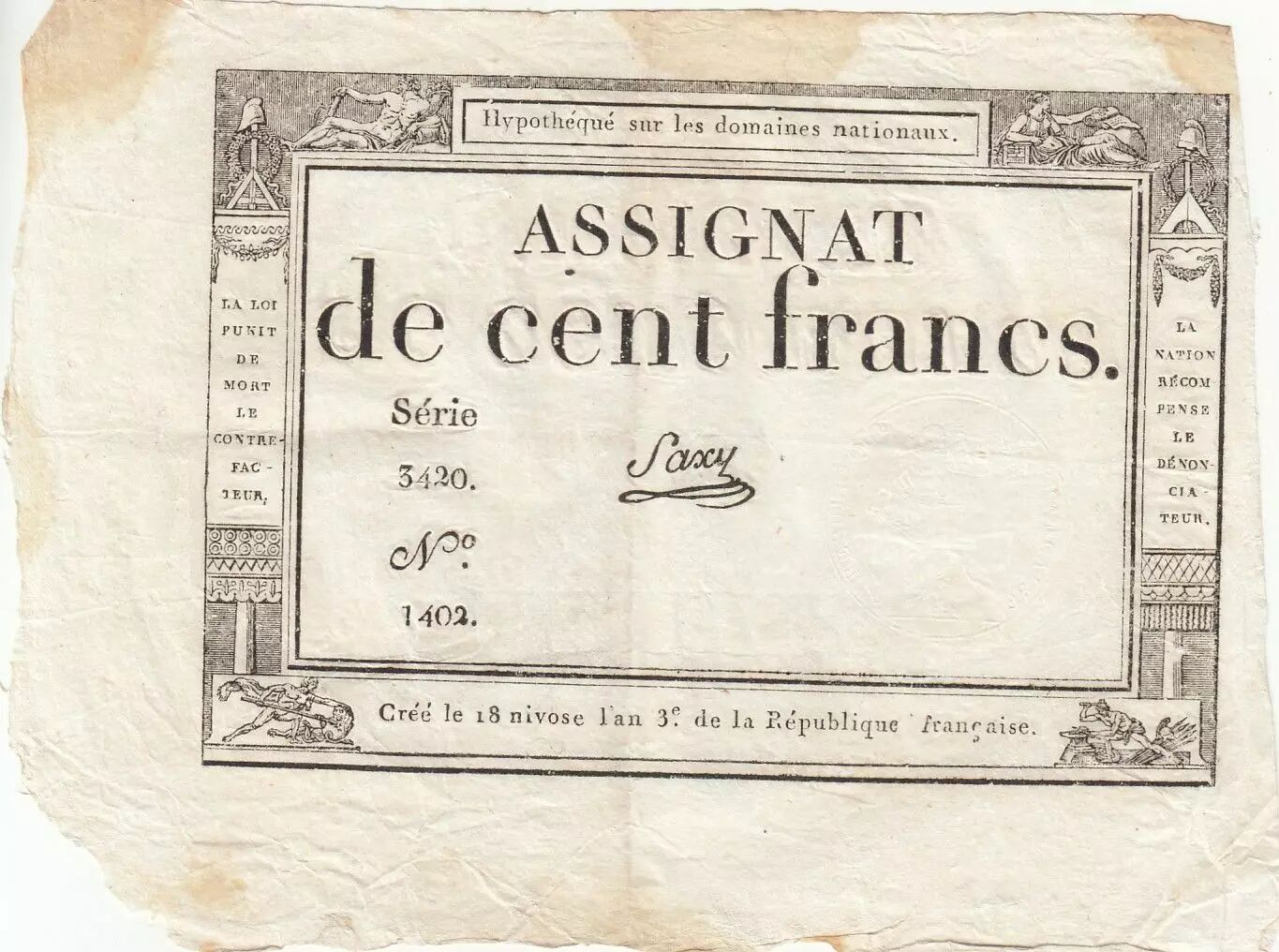 Banknote France 100 Francs - 18 Nivose An III - (07.01.1795) - Sign. Saxy - Serial 3420