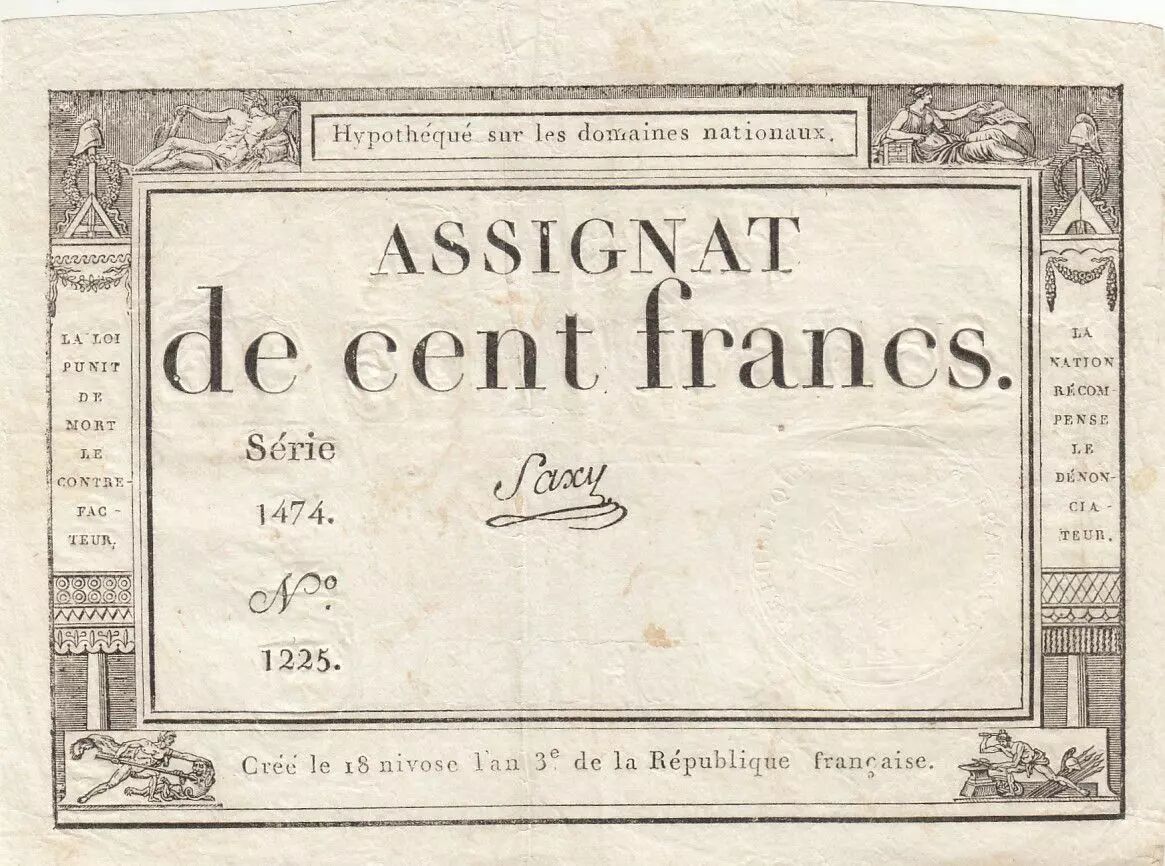 Billet France 100 Francs - 18 Nivose An III - (07.01.1795) - Sign. Saxy - Série 1474