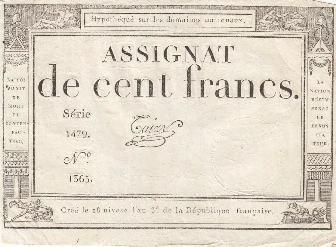 Banknote France 100 Francs - 18 Nivose An III - (07.01.1795) - Sign. Taizy - Serial 1479