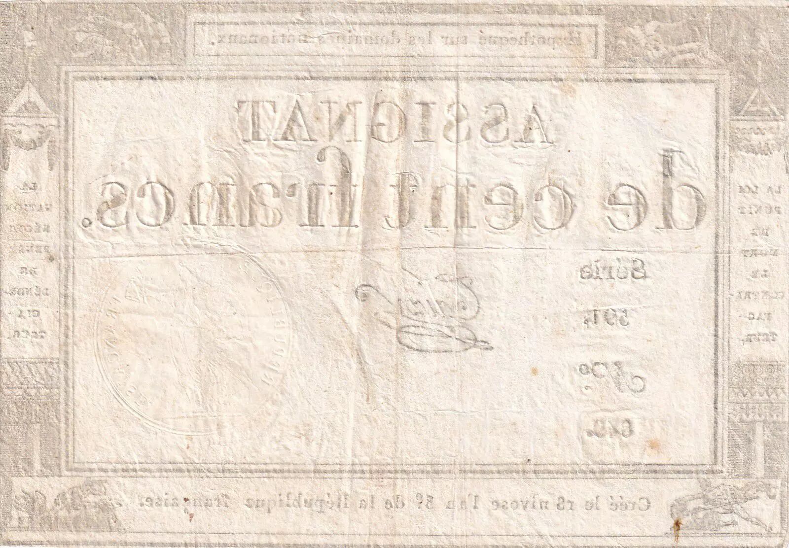 Banknote France 100 Francs - 18 Nivose An III - (07.01.1795) - Sign. Taizy - Serial 591 - P.78