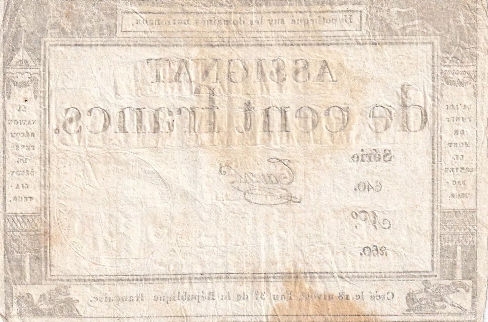 Banknote France 100 Francs - 18 Nivose An III - (07.01.1795) - Sign. Taizy - Serial 640 - P.78