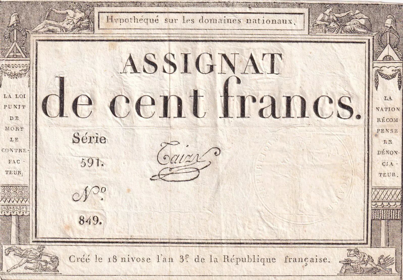 Billet France 100 Francs - 18 Nivose An III - (07.01.1795) - Sign. Taizy - Série 591 - L.173
