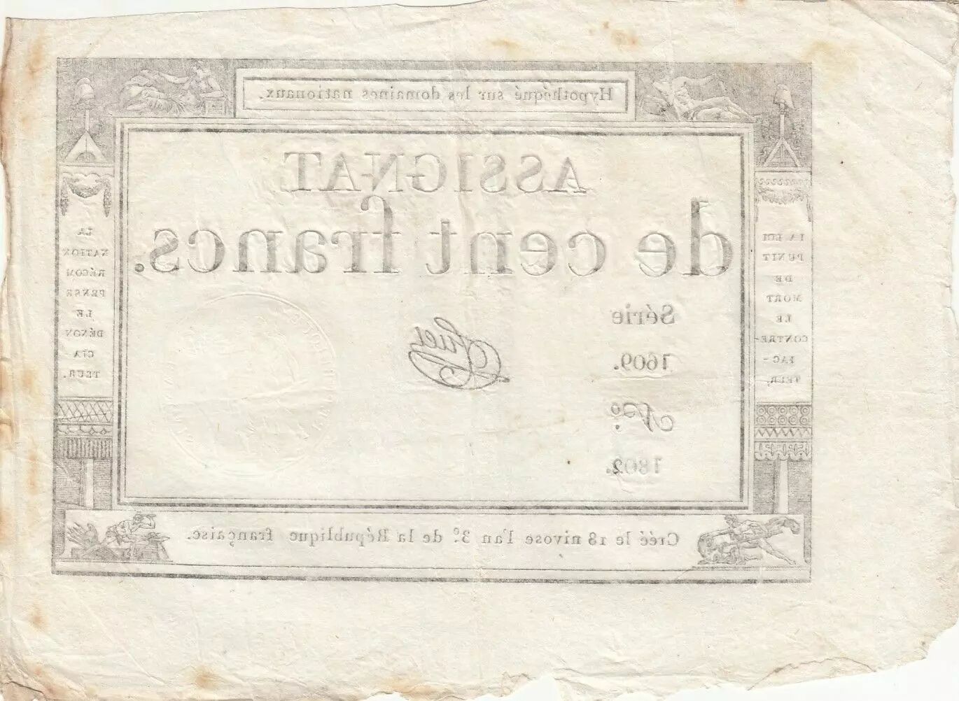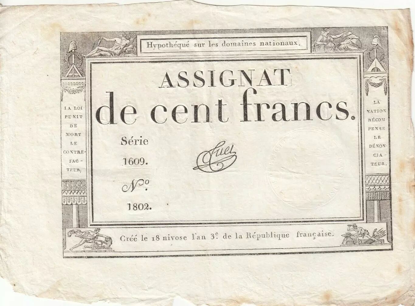 Banknote France 100 Francs - 18 Nivose An III - (07.01.1795) - Sign. Tuet - Serial 1609