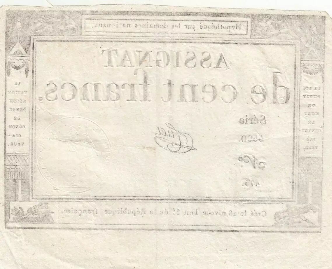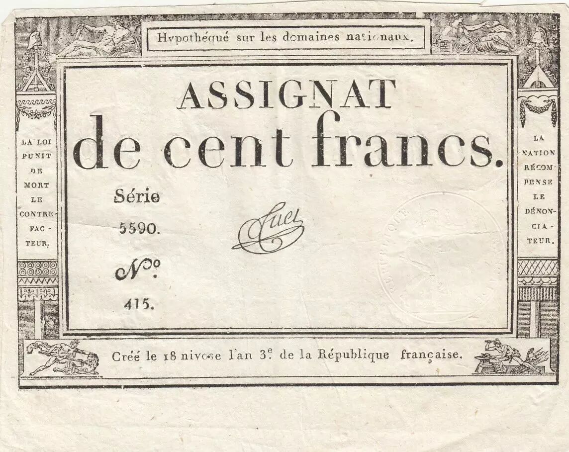 Banknote France 100 Francs - 18 Nivose An III - (07.01.1795) - Sign. Tuet - Serial 5590
