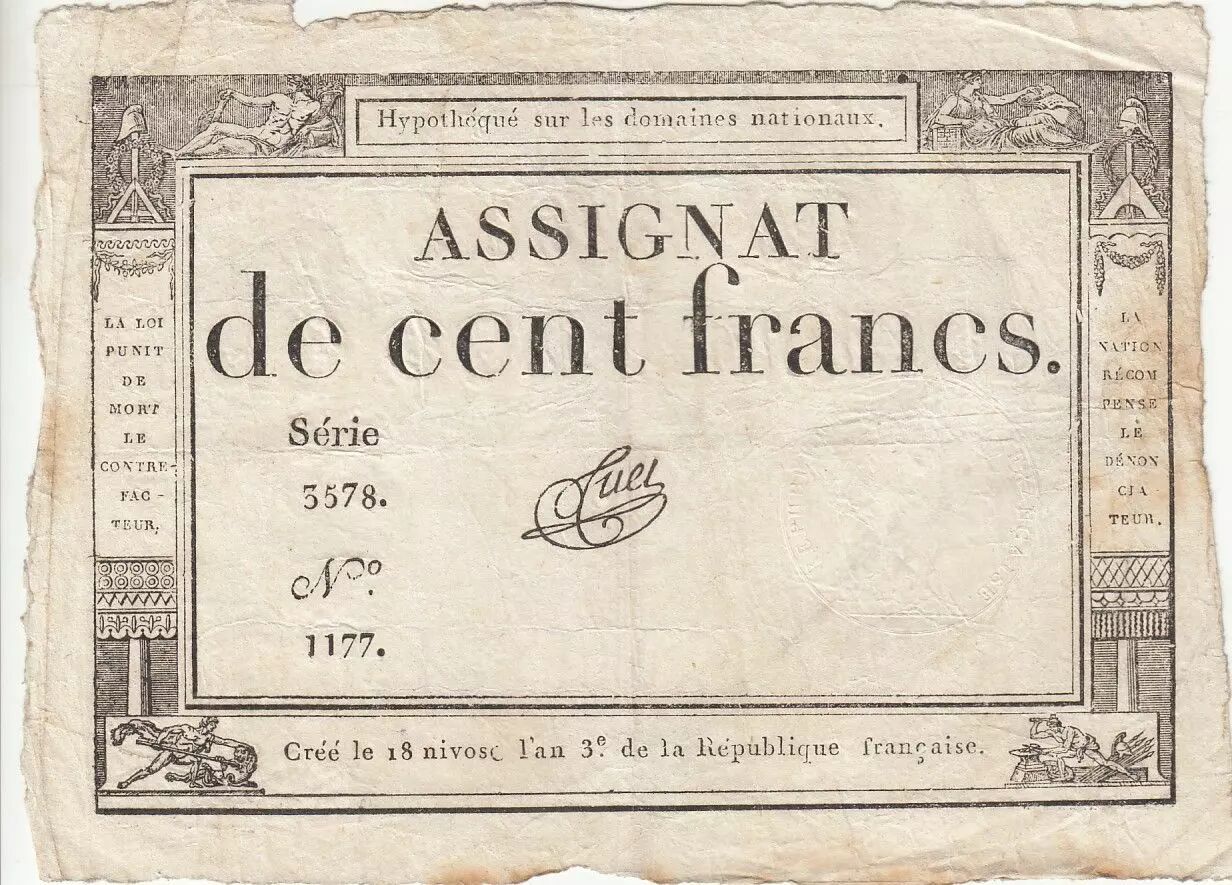 Billet France 100 Francs - 18 Nivose An III - (07.01.1795) - Sign. Tuet - Série 3578