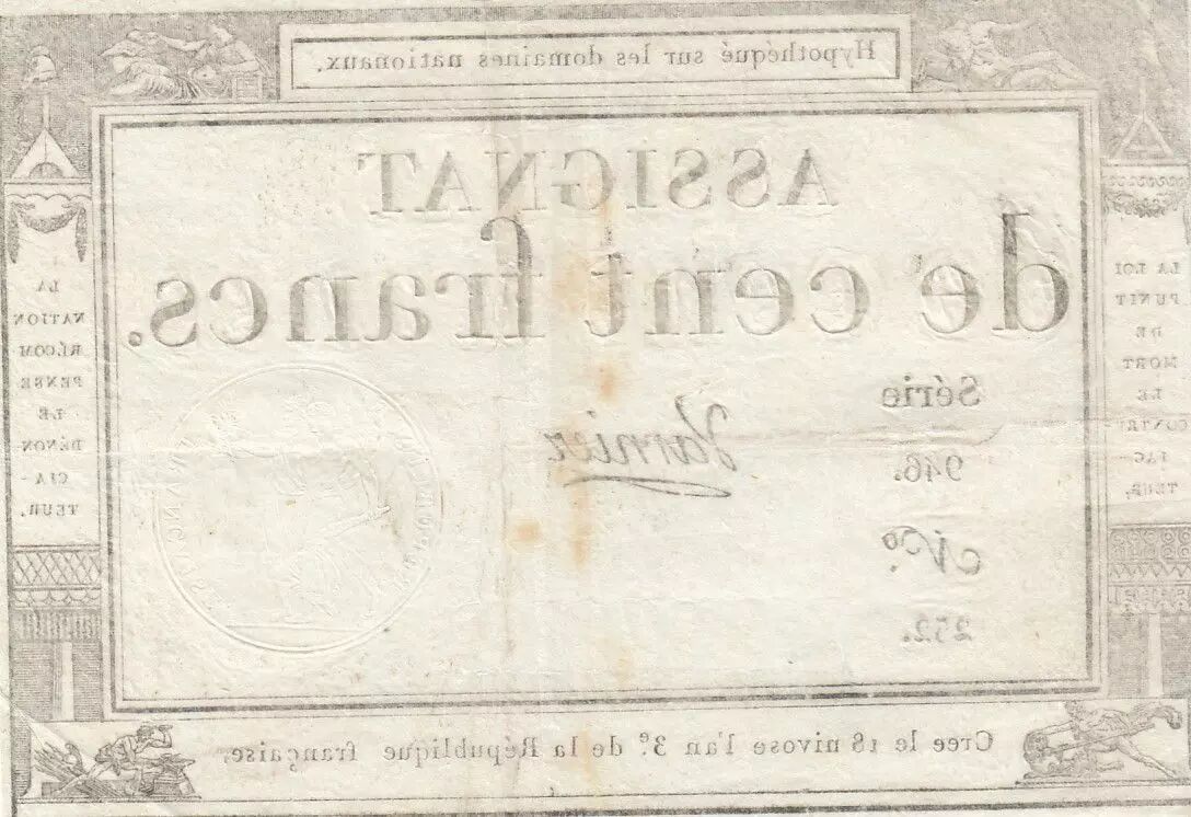 Banknote France 100 Francs - 18 Nivose An III - (07.01.1795) - Sign. Varnier - Serial 946