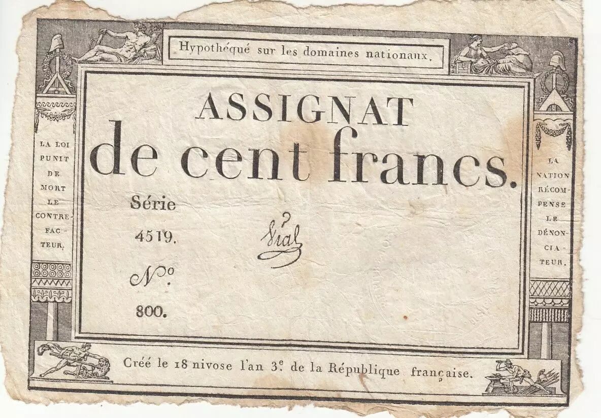 Banknote France 100 Francs - 18 Nivose An III - (07.01.1795) - Sign. Vial - Serial 4519