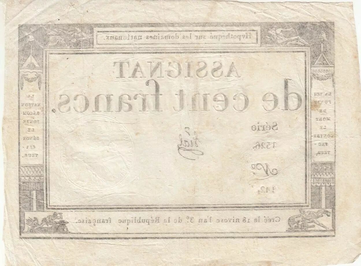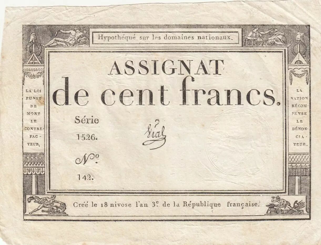 Accueil > Archivage > archivage-Billets Français > France 100 Francs - 18 Nivose An III - (07.01.1795) - Sign. Vial - Série 1526