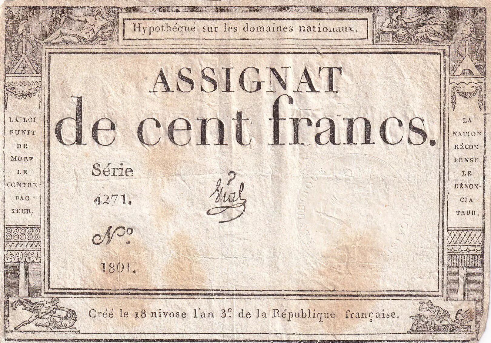 Accueil > Archivage > France 100 Francs - 18 Nivose An III - (07.01.1795) - Sign. Vial - Série 4271 - L.173
