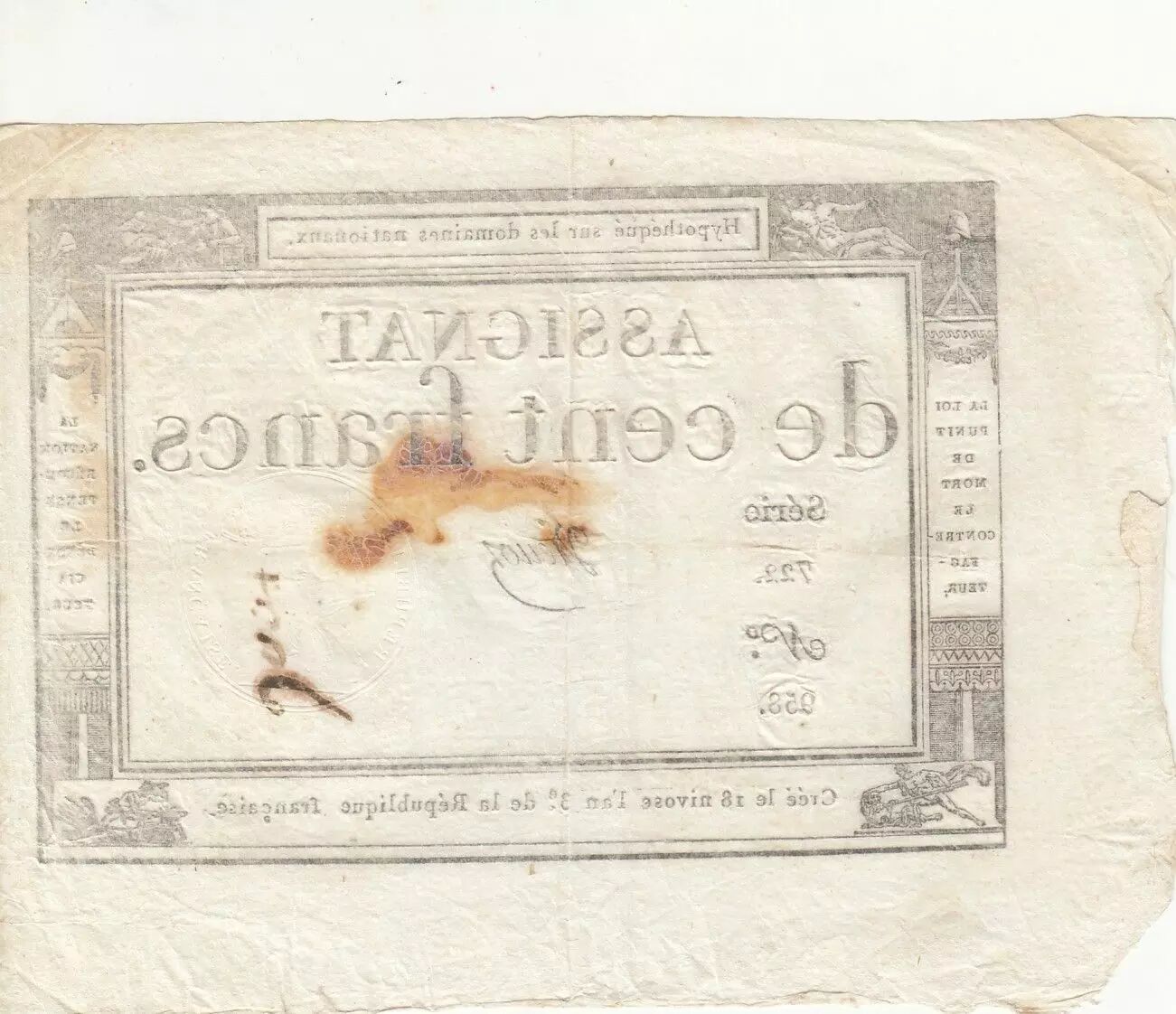 Banknote France 100 Francs - 18 Nivose An III - (07.01.1795) - Sign. Vienoz - Serial 722