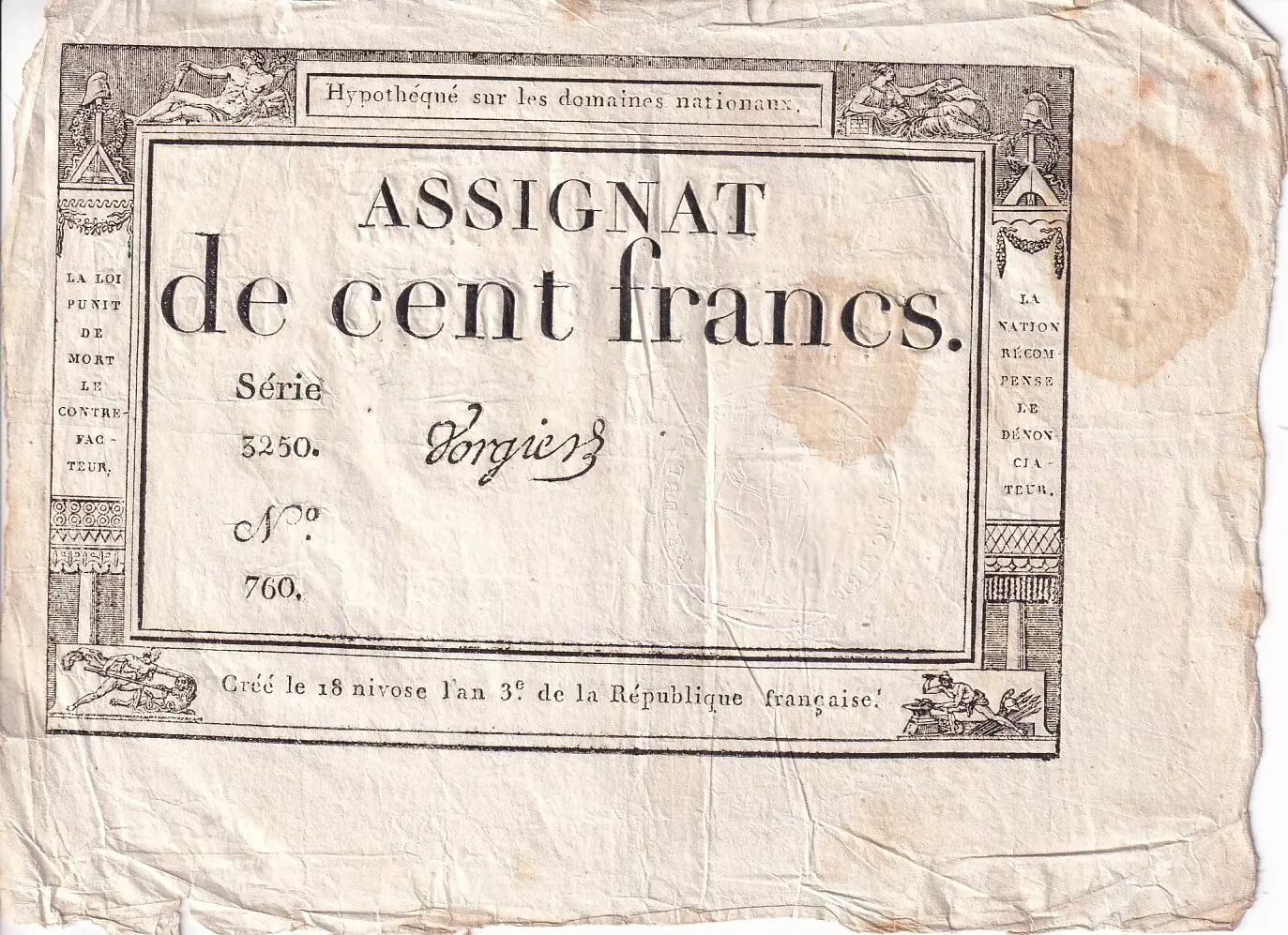 Home > > France 100 Francs - 18 Nivose An III - (07.01.1795) - Sign. Vorgier - Serial 3250