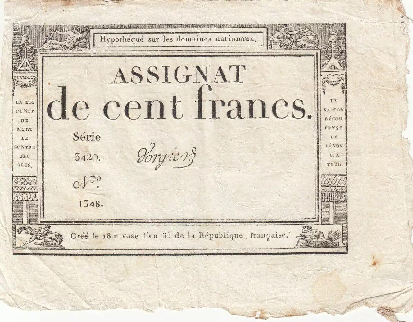 Banknote France 100 Francs - 18 Nivose An III - (07.01.1795) - Sign. Vorgier - Serial 3420