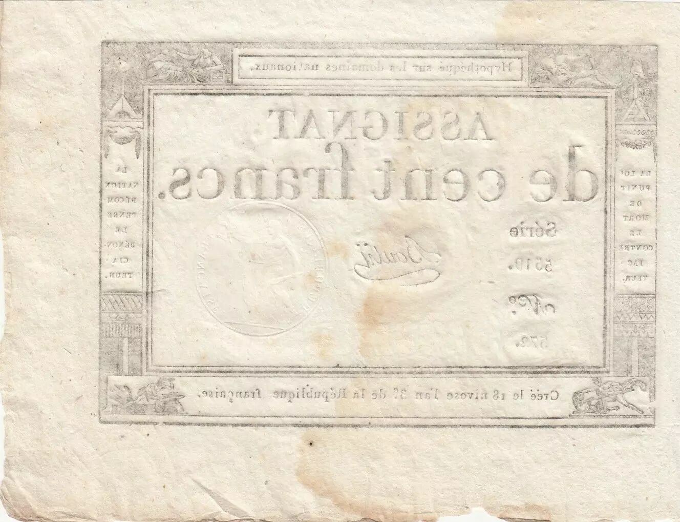 Banknote France 100 francs - 18 Nivose An III - 1794 - Sign. Bouly - Serial 5519