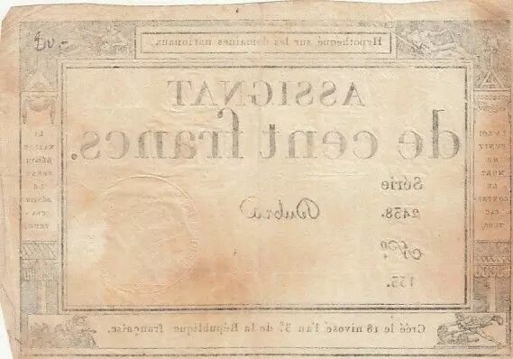 Home > French Banknotes > Assignats > 100 Francs > France 100 francs - 18 Nivose An III - 1794 - Sign. Dubra - Serial 2438