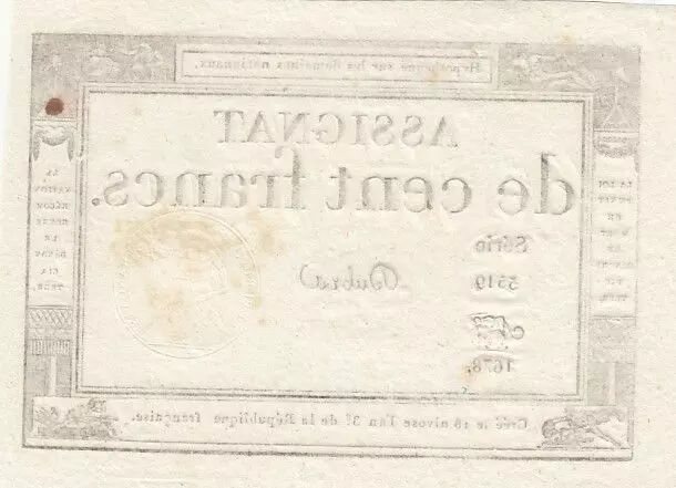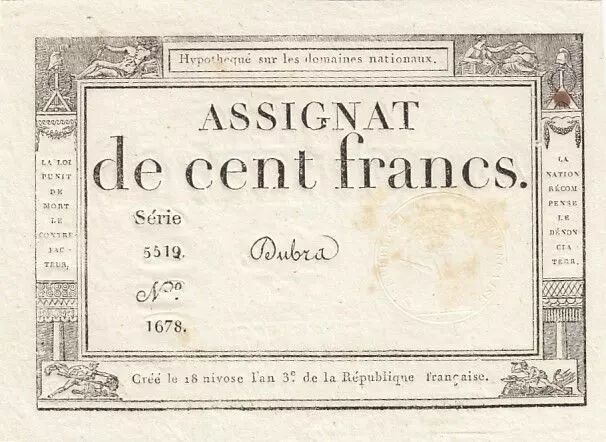 Banknote France 100 francs - 18 Nivose An III - 1794 - Sign. Dubra - Serial 5519