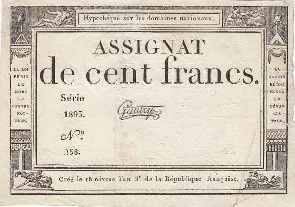 Billet France 100 francs - 18 Nivose An III - 1794 - Sign. Gautry - Série 1893