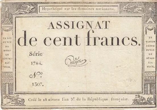 Billet France 100 francs - 18 Nivose An III - 1794 - Sign. Guyon - Série 1784