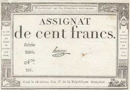 Banknote France 100 francs - 18 Nivose An III - 1794 - Sign. Henry - Serial 3605