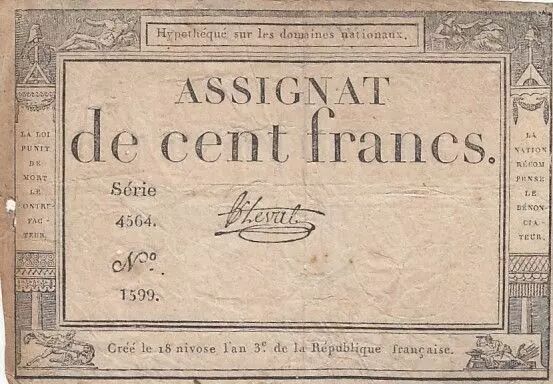 Billet France 100 francs - 18 Nivose An III - 1794 - Sign. Leval - Série 4564