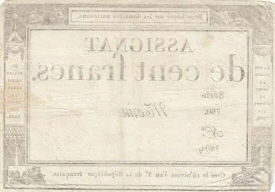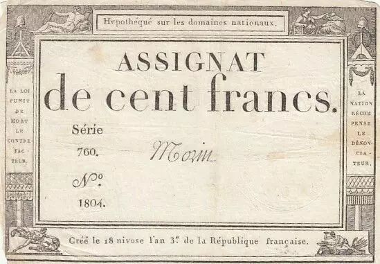 Billet France 100 francs - 18 Nivose An III - 1794 - Sign. Morin - Série 760
