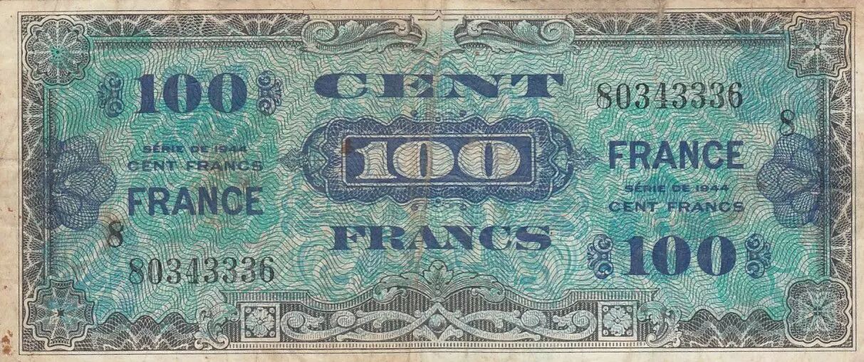 Home > > France 100 Francs - Allied Military Currency - 1944 - Serial 8 - Num 80343336