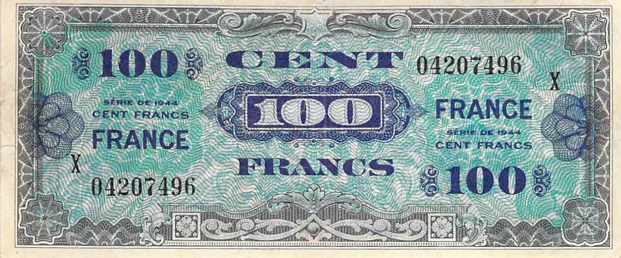 Banknote France 100 Francs Allied Military Currency - 1945 big X Serial - F+