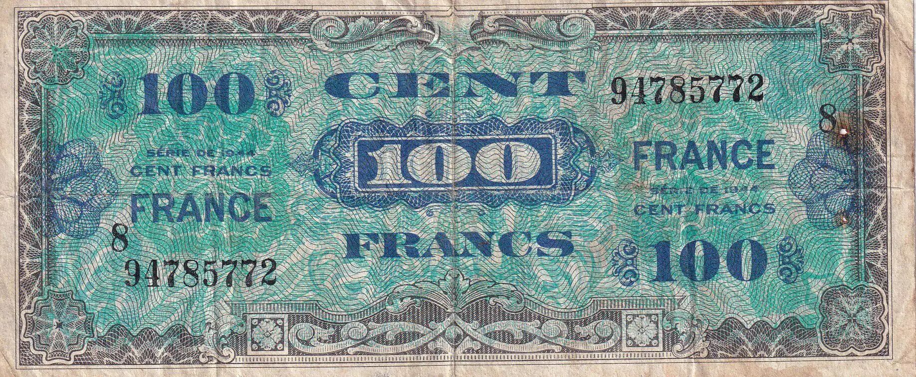 Banknote France 100 Francs - Allied Military Currency - 1945 - Serial 8 - F - P.123c
