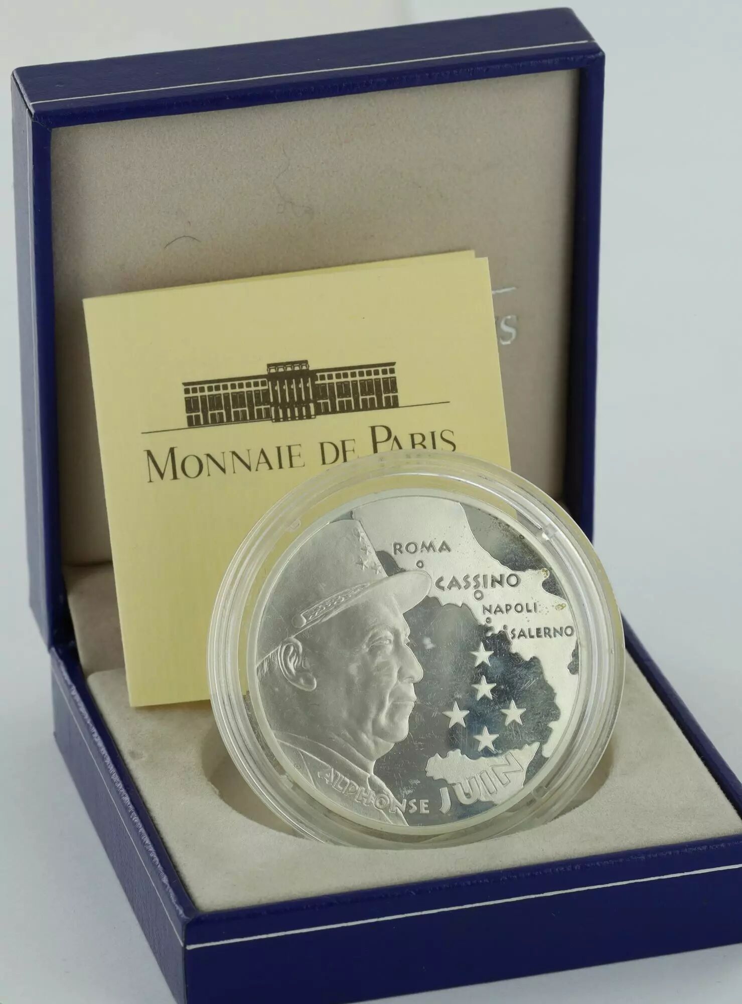 Le revers de la pièce met en scène un buste du Maréchal Juin orienté vers la gauche. Devant le buste, on observe une carte de l'Italie sur laquelle sont positionnées cinq étoiles. Les inscriptions "ROMA", "CASSINO", "NAPOLI", "SALERNO" et "ALPHONSE JUIN" sont également présentes.