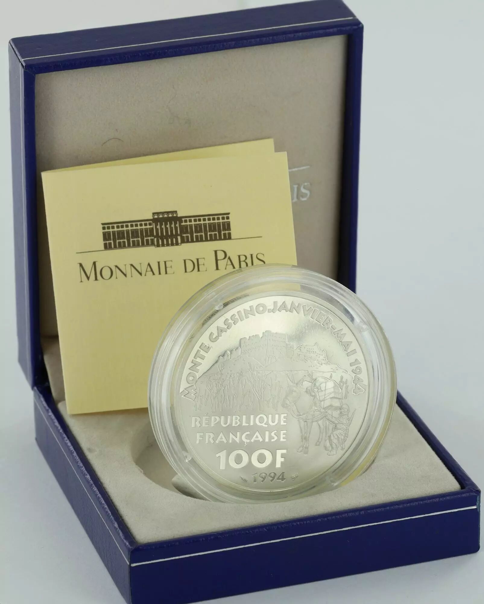 L'avers de la pièce présente, au premier plan, un âne transportant un soldat. En arrière-plan, on distingue la ville de Monte Cassino. Les inscriptions en latin indiquent "MONTE CASSINO . JANVIER RÉPUBLIQUE FRANÇAISE 100F 1994".