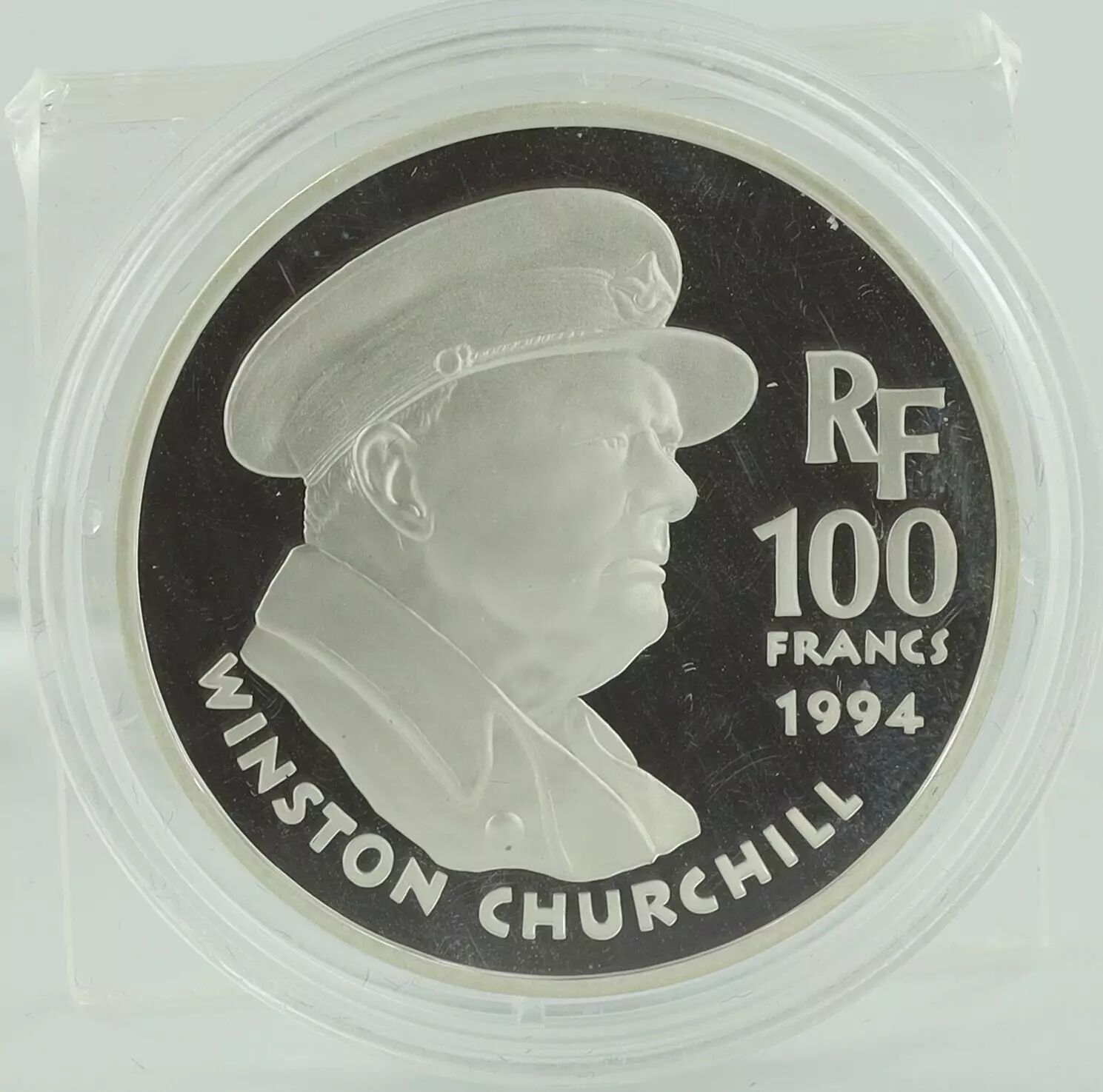L'avers de la pièce présente un portrait de Winston Churchill. On y trouve également les inscriptions "RF" (République Française), la valeur faciale "100 FRANCS", et l'année d'émission "1994". Le nom "WINSTON CHURCHILL" est aussi présent sur cette face. Le graveur de cette face est Bernard Turlan.