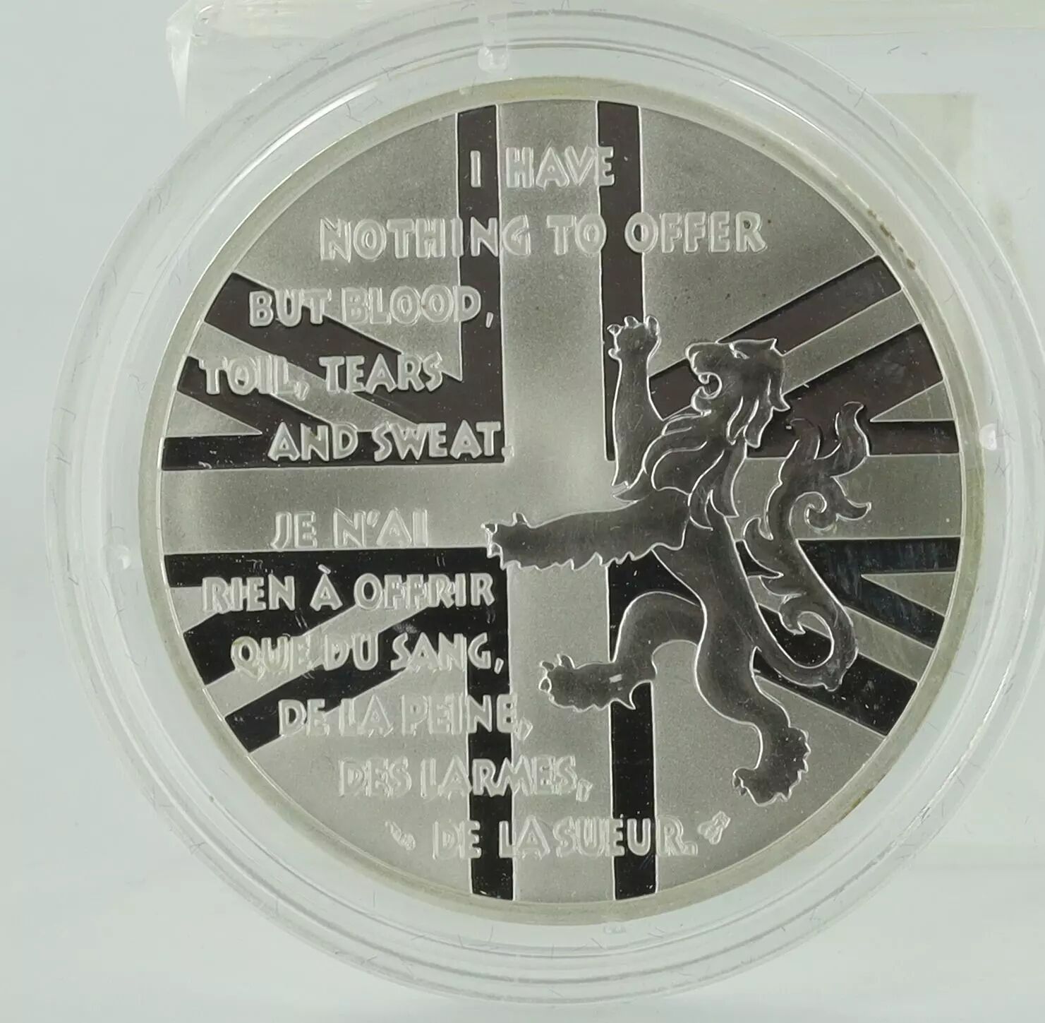 Le revers de la pièce reproduit un extrait du discours de Winston Churchill aux Communes. La citation est gravée en anglais et en français : "I HAVE NOTHING TO OFFER BUT BLOOD, TOIL, TEARS AND SWEAT" et "JE N?AI RIEN À OFFRIR QUE DU SANG, DE LA PEINE, DES LARMES, DE LA SUEUR." Bernard Turlan est également le graveur de cette face.