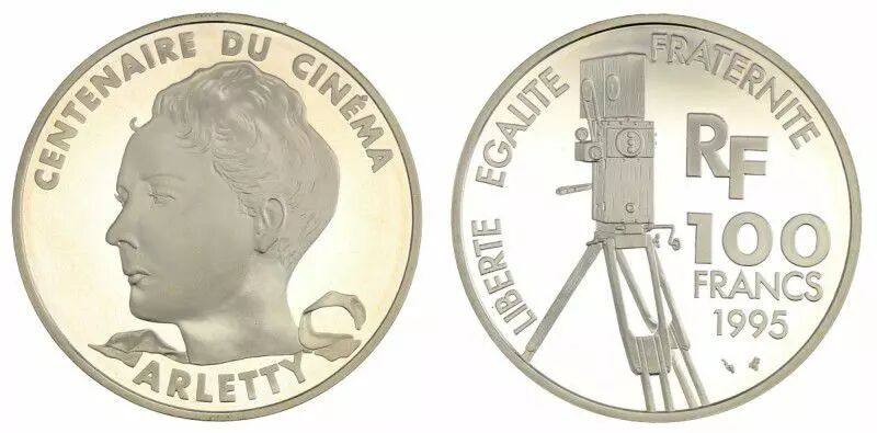 On the obverse side, there is a finely engraved portrait of Arletty, capturing her unique expression and elegance. Beside her, a stylized camera symbolizes her unforgettable contributions to French cinema and the golden age of film. The name "Arletty" appears alongside the inscription "Centenaire du Cinéma" and the year 1995, underscoring the coin's connection to this historic celebration.