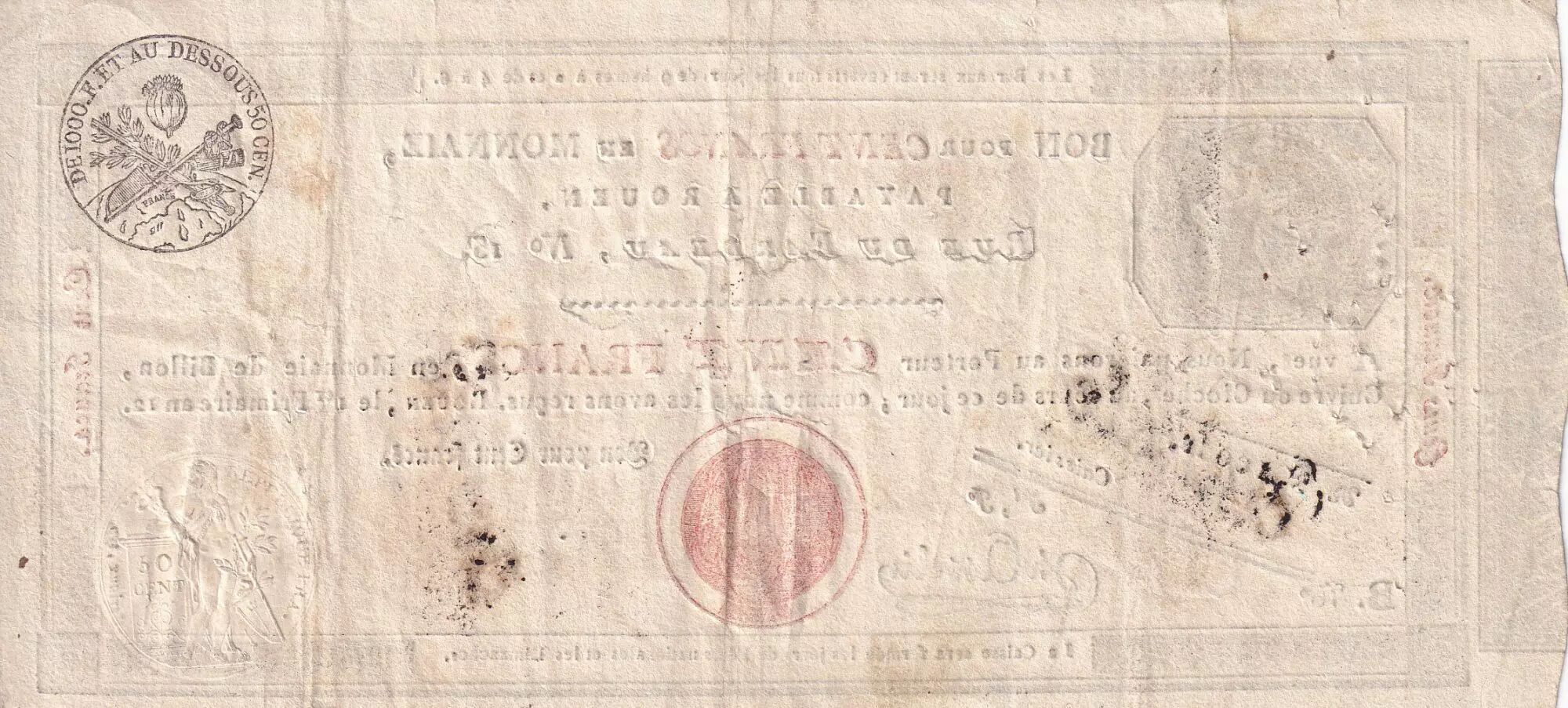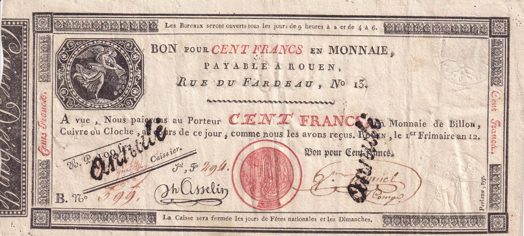 Billet France 100 Francs - Caisse d'échange des Monnaies Rouen - 1803 - TTB