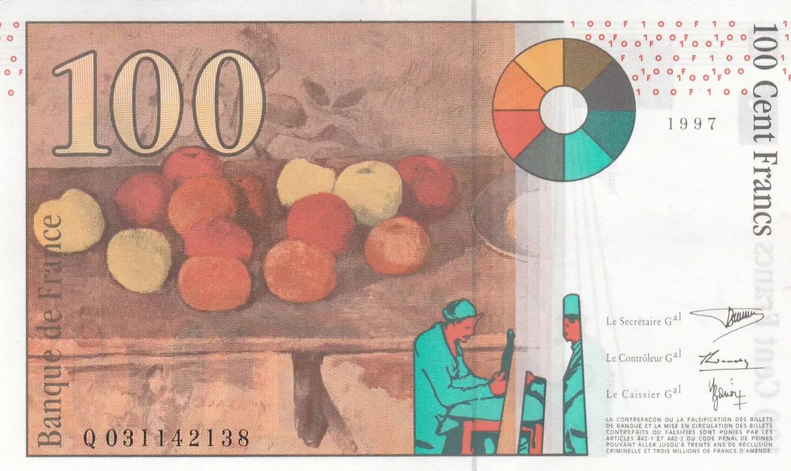 Banknote France 100 Francs - Cezanne - 1997 - Serial Q031