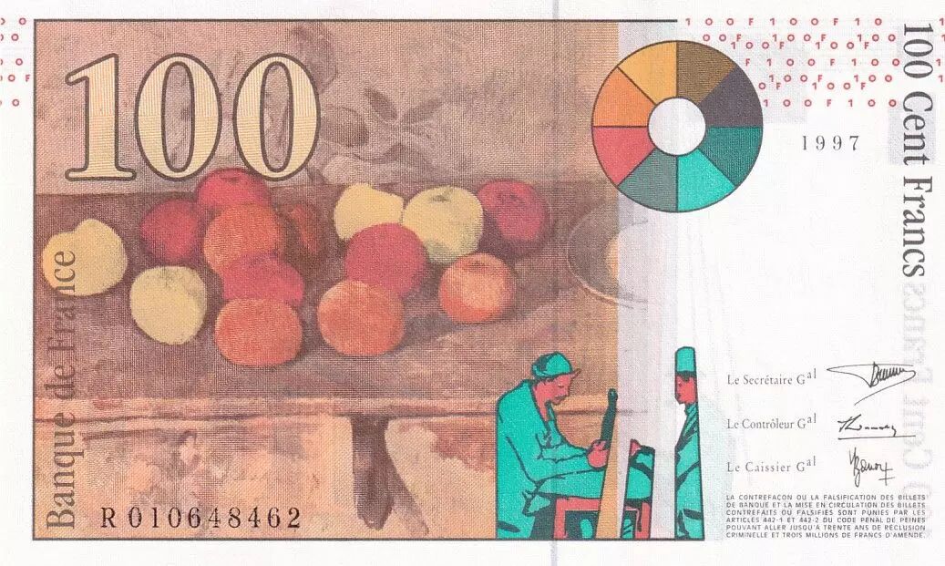 Le billet de 100 francs français, émis en 1997, est dédié à la figure du peintre Paul Cézanne. Ce billet commémoratif présente des dimensions de 133 millimètres de longueur et 80 millimètres de hauteur.