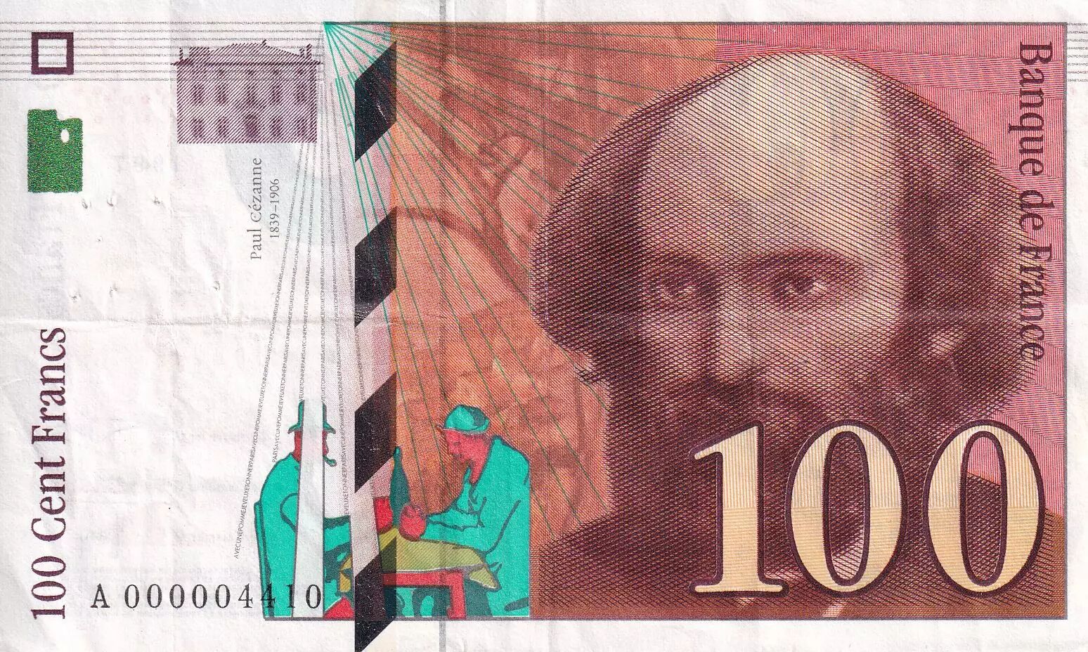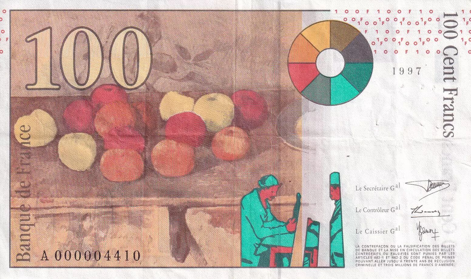 Accueil > Billets Français > Billets Banque de France > Billets 100 Francs > Cézanne type 1997 (1997-1998) > France 100 Francs - Cézanne - Petit numéro - 1997 - A000004410 - F.74.01A