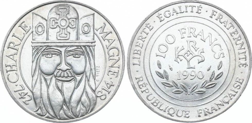 The 100 Francs ?Charlemagne? coin issued in 1990 is part of the series of French commemorative coins of the Fifth Republic. It celebrates the 1190th anniversary of Charlemagne?s coronation (800?1990), a major figure in European history often considered the ?father of Europe?. This issue illustrates France?s desire to promote its historical heritage through highly symbolic circulation coins.