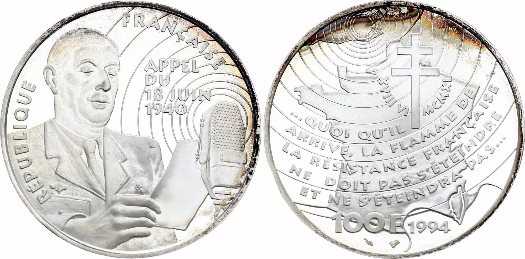 Le revers de la pièce illustre une représentation de la France avec la croix de Lorraine, traversée par des ondes provenant d'une station de radio britannique, dont une partie est visible. L'inscription "XVIII VI MCMXL" est présente, suivie d'une citation de Charles de Gaulle : "... QUOI QU?IL ARRIVE, LA FLAMME DE LA RÉSISTANCE FRANÇAISE NE DOIT PAS S?ÉTEINDRE ET NE S?ÉTEINDRA PAS ...". La valeur nominale "100 F" et l'année d'émission "1994" sont également indiquées.