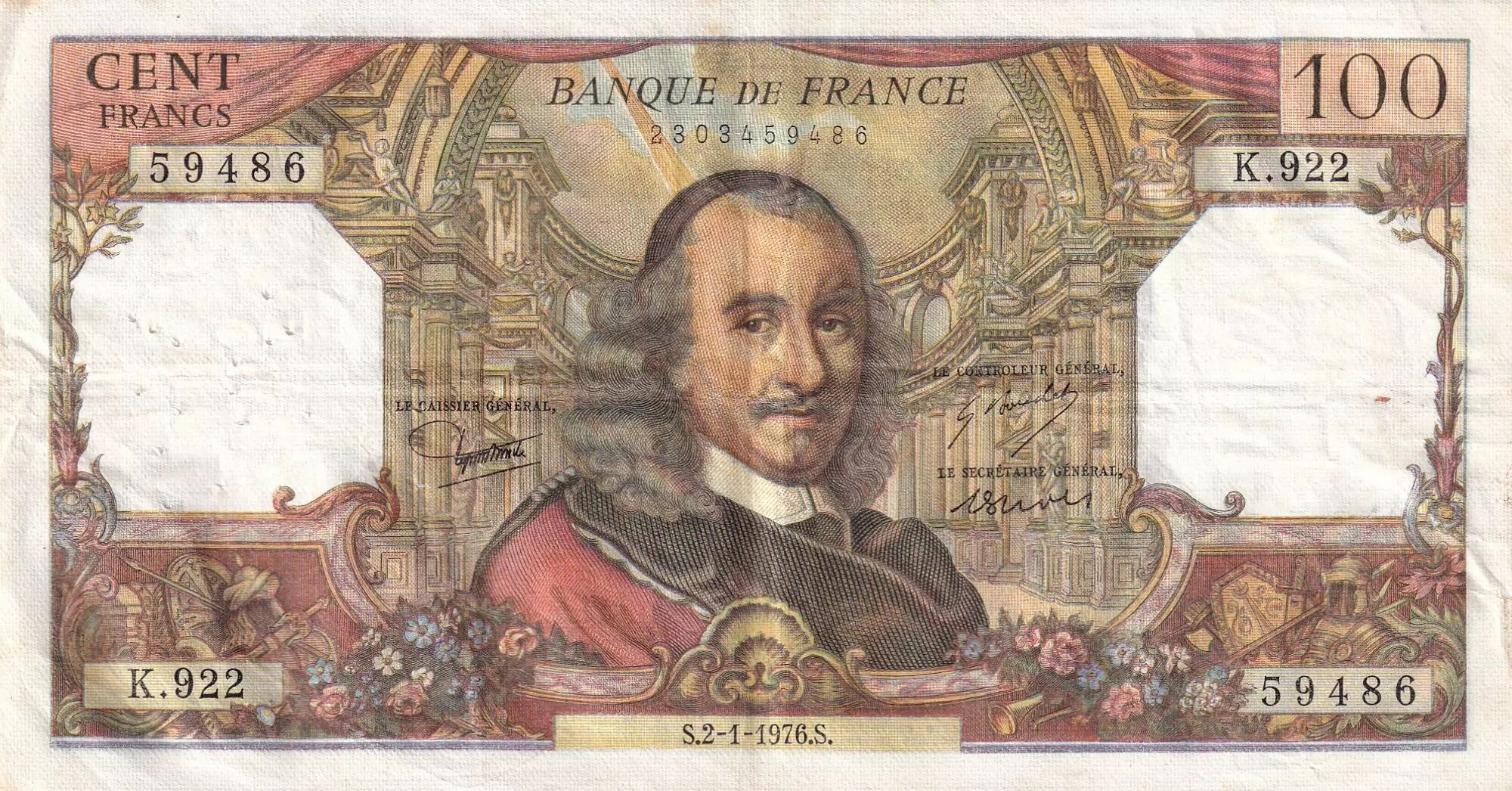 Banknote France 100 Francs - Corneille - 02-01-1976 - Serial K.922