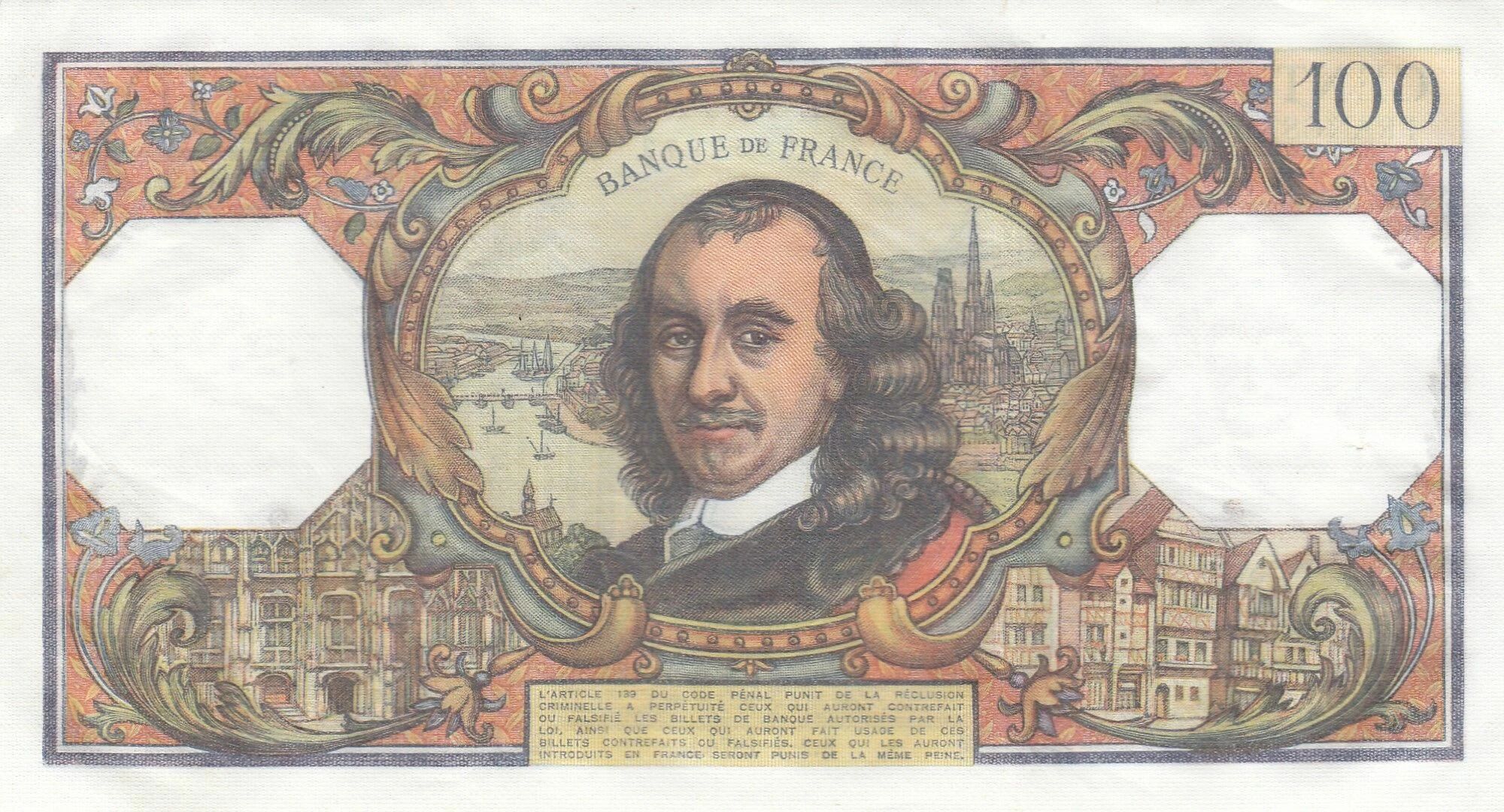 On the front of the banknote, you can see a portrait of Pierre Corneille, inspired by engravings from the time. The portrait is surrounded by ornamental motifs and symbols evoking theater and literature. The face value, "100 Francs," is clearly indicated in numbers and letters.