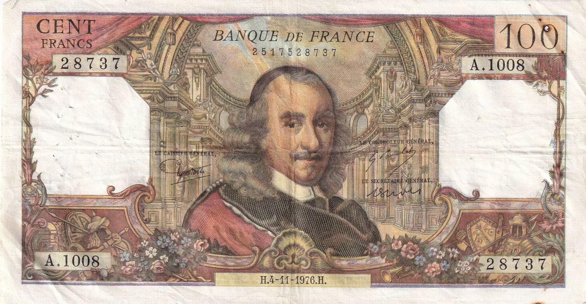 Banknote France 100 Francs - Corneille - 04-11-1976 - Serial A.1008