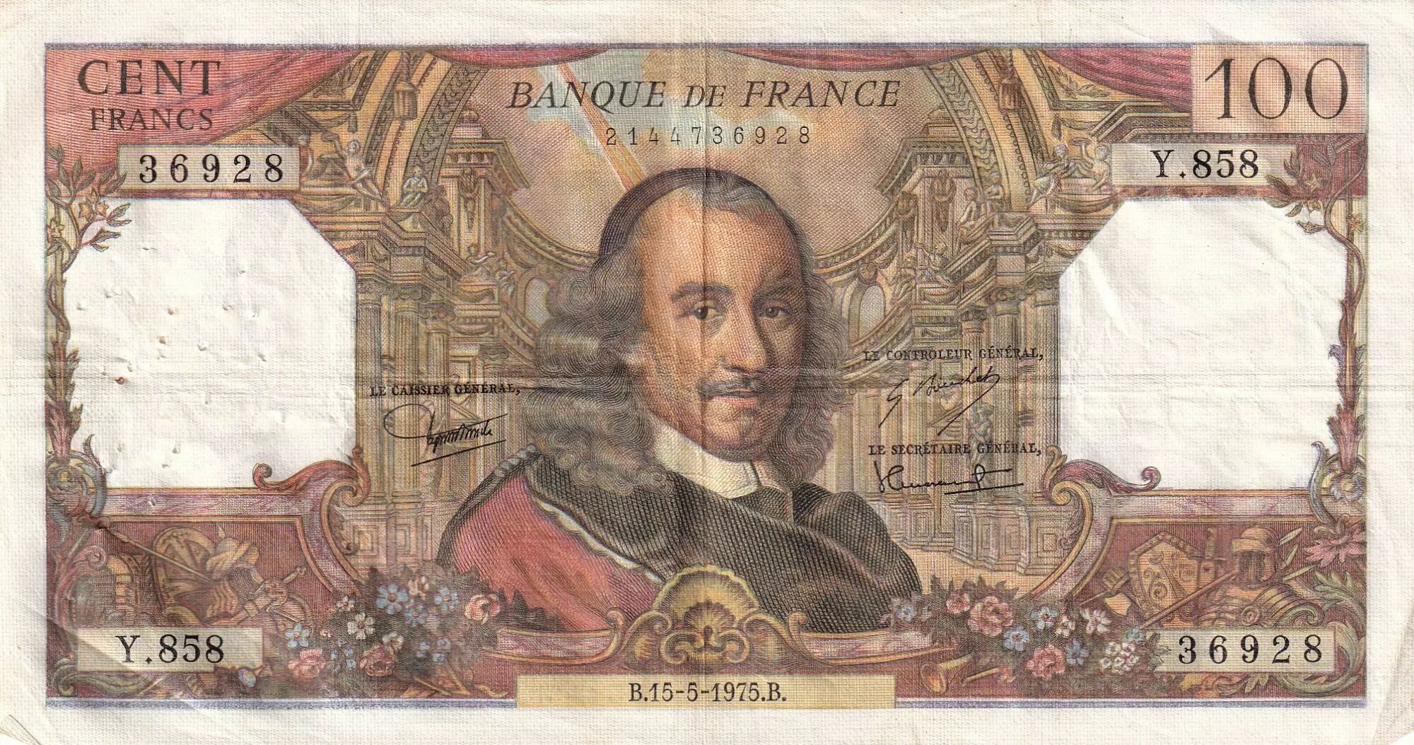 Banknote France 100 Francs - Corneille - 15-05-1975 - Serial Y.858