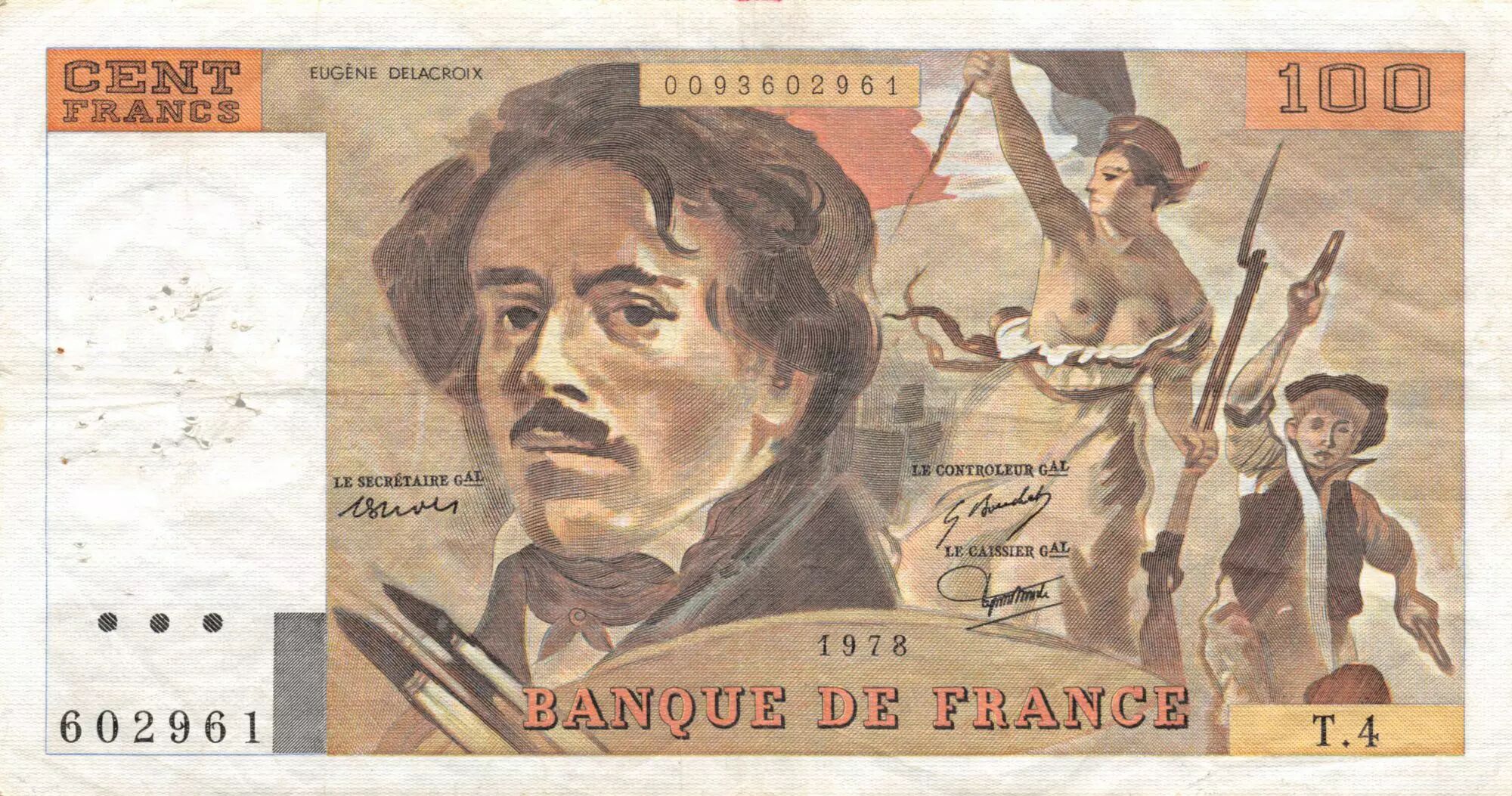 Banknote France 100 Francs Delacroix - 1978 Serial T.4 - Hatched - VF