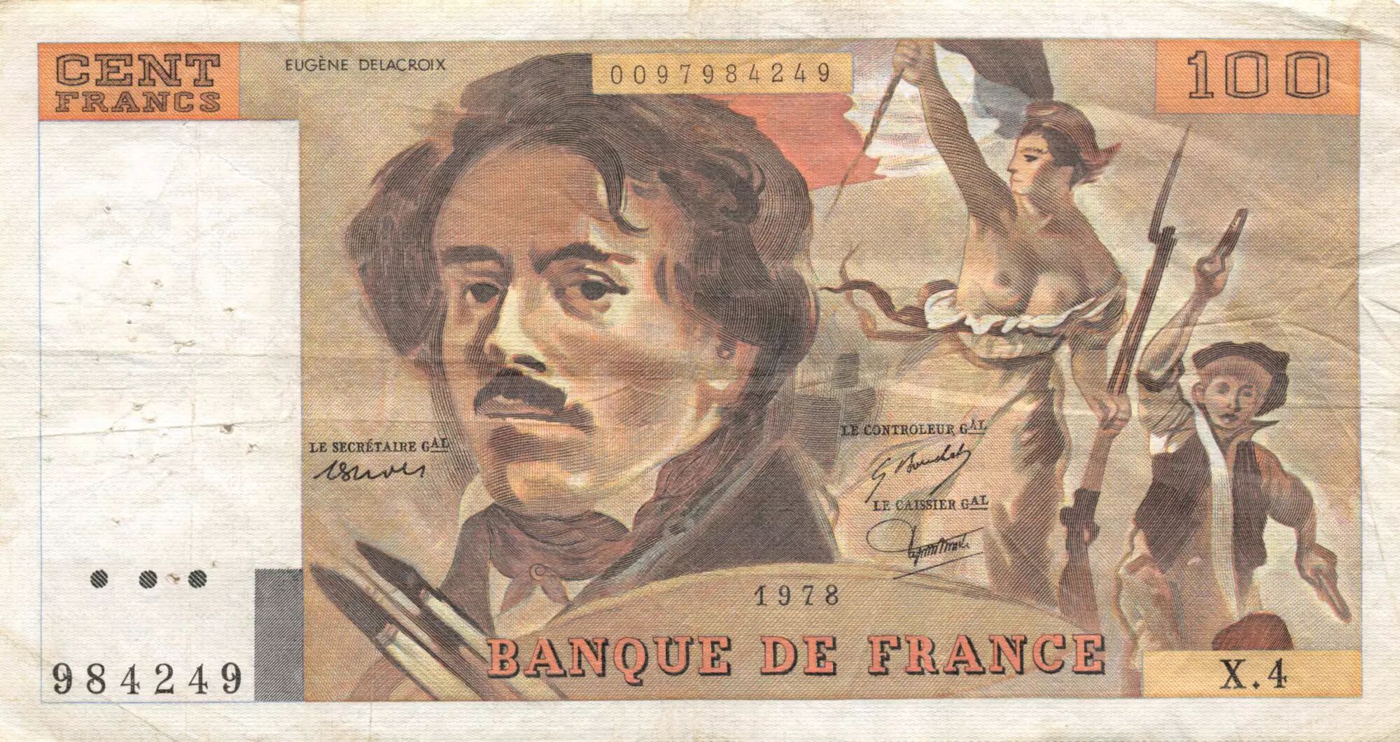 Banknote France 100 Francs Delacroix - 1978 Serial X.4 - Hatched - VF