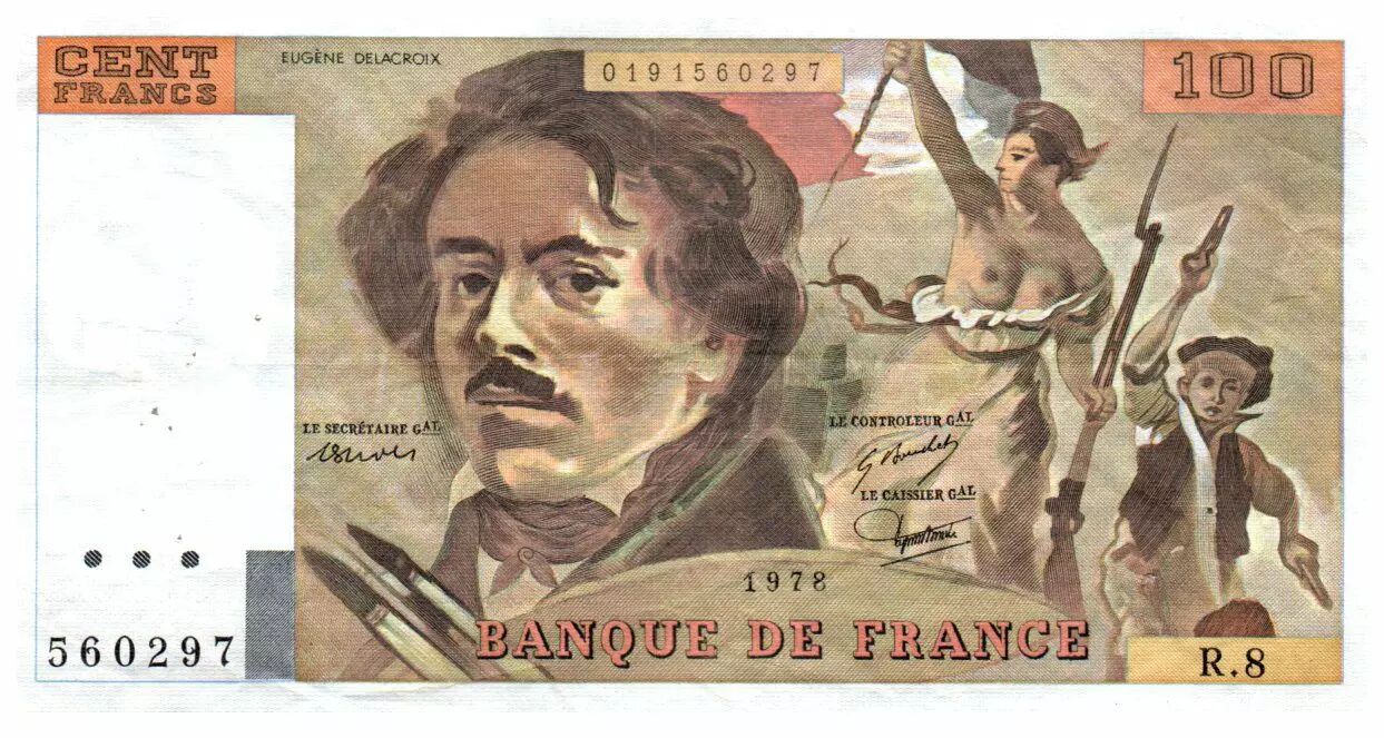 Accueil > Billets Français > Billets Banque de France > Billets 100 Francs > Delacroix type 1978 (1978-1995) > France 100 Francs Delacroix - 1978 Série R.8 - Grand filigrane - TTB