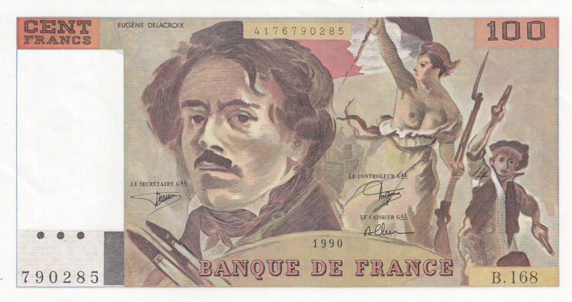 This French banknote has a face value of 100 francs. It was issued in 1990.