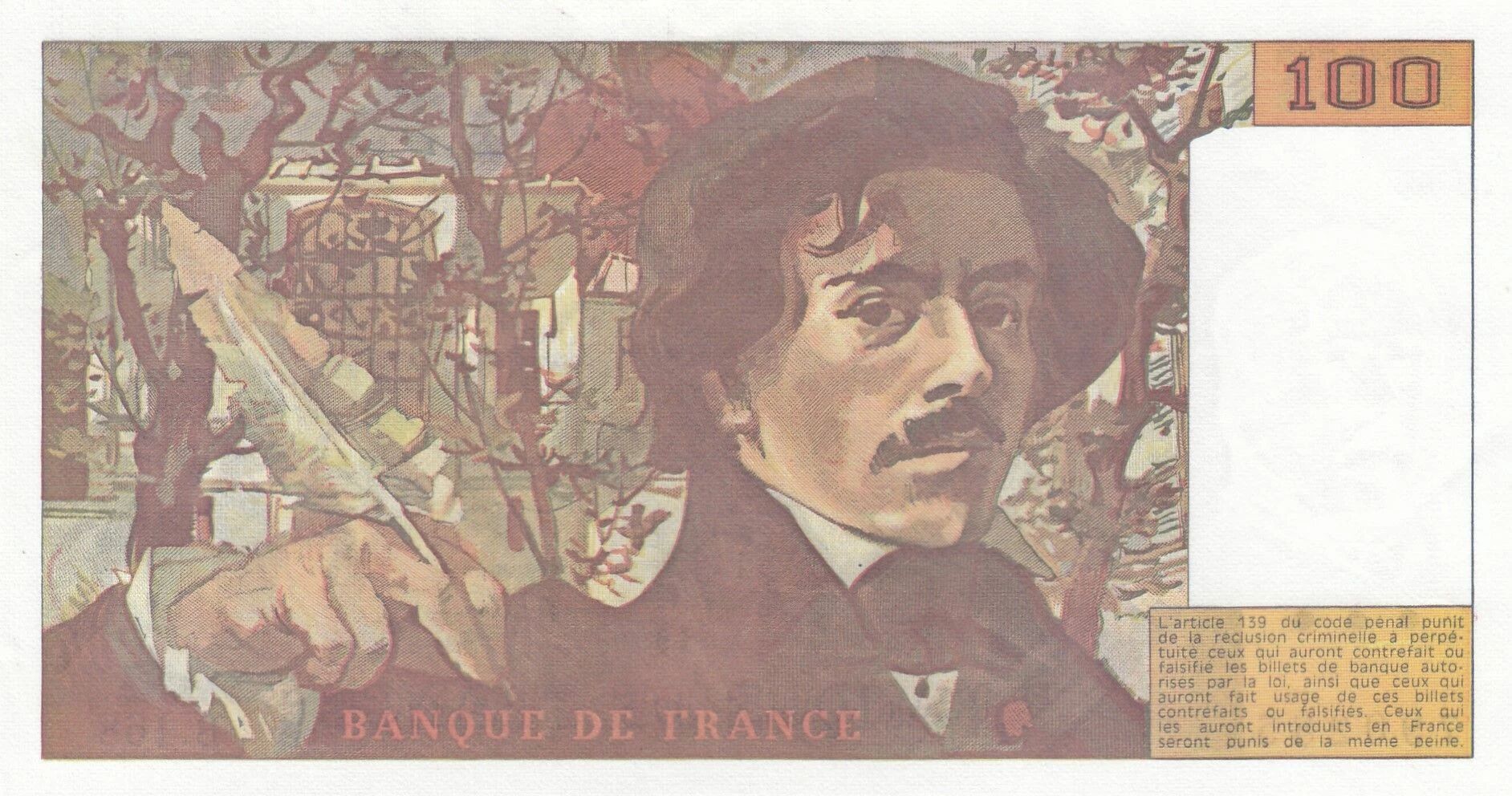 On the front of the banknote, there is a portrait of Eugène Delacroix, a famous 19th-century French painter. Next to him, a representation of his iconic work, "Liberty Leading the People", is visible. The painter's name, "Eugène Delacroix", is written out in full. The mention "Banque de France" also appears, underlining the issuing institution. The face value, "100 Francs", is indicated in numbers and letters.