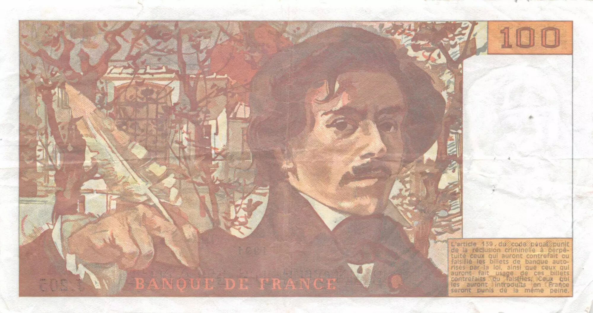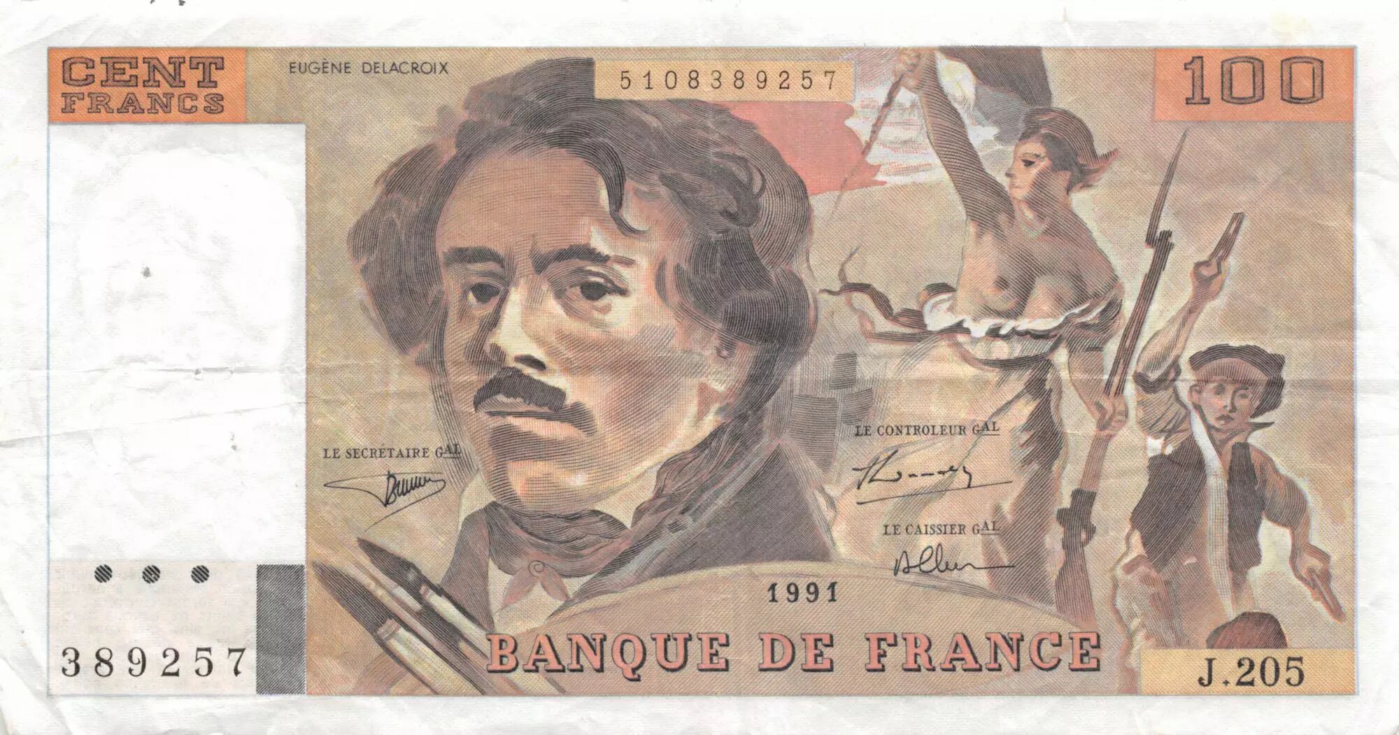 Banknote France 100 Francs Delacroix - 1991 Serial J.205-389257 - VF