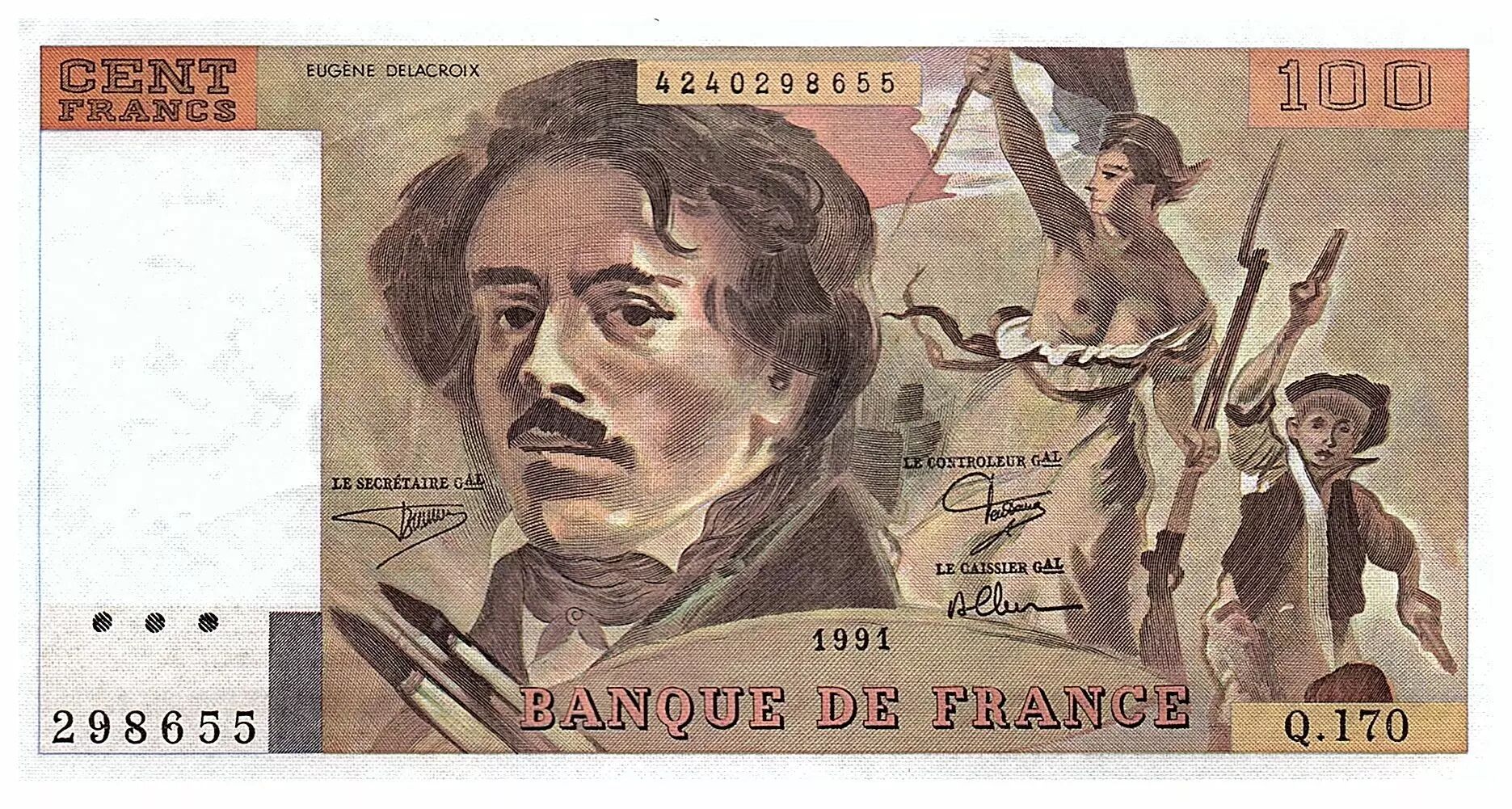 Home > French Banknotes > Bank of France Banknotes > 100 Francs Banknotes > Delacroix Type 1978 (1978-1995) > France 100 Francs Delacroix - 1991 - Serial Q.170 - large watermark - Fay.69bis.031a